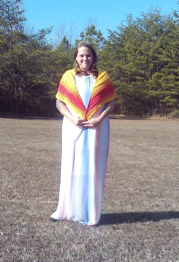 This one of a kind shawl is the perfect item for someone who loves yellows, oranges, and reds!