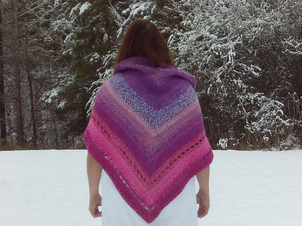 - Vibrant Color Transition: The yarn features a beautiful gradient colorway, seamlessly moving through rich, complementary hues like deep purple, vibrant magenta, and striking pink. This dramatic shift in color makes the shawl an immediate focal point of any outfit.